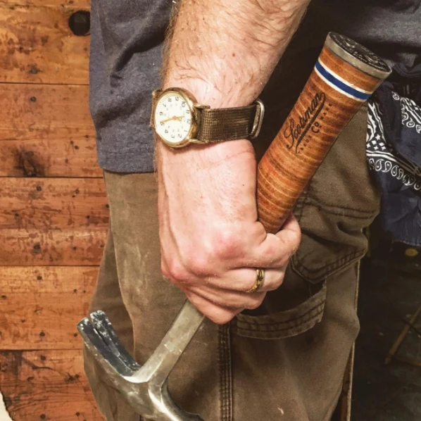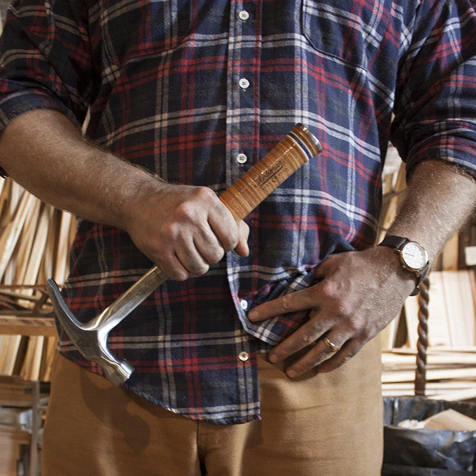 Ben’s daddy raised his boys to respect tools. They could use anything from his shop, as long as they put it back, but there were a few things that weren’t to be used. He remembers his daddy’s 20 oz. Estwing hammer, the old rubber handle worn and stained, and to this day, Ben is proud when he lets him use it. We knew we wanted to sell our own version, co-branded with Scotsman Co. and Estwing, with a leather handle and Scotsman blue washers. We hope you will use these hammers, respect them, and then pass them down.Â